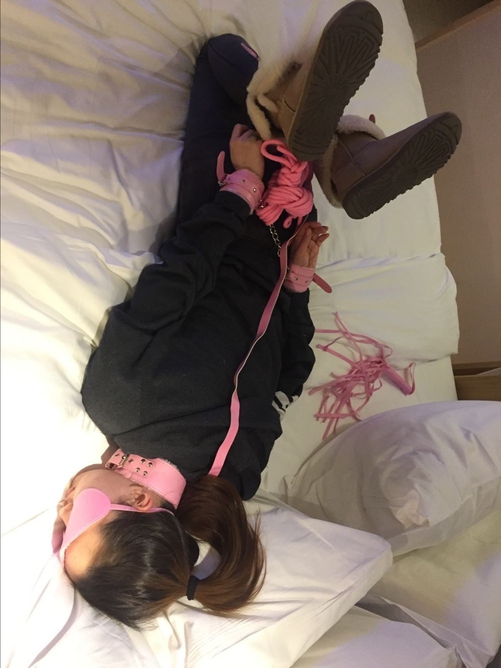 把美女扔在床上,先是穿着衣服,捆绑起来,欣赏一下平时高高在上的美女是如何穿着自己的衣服被征服的