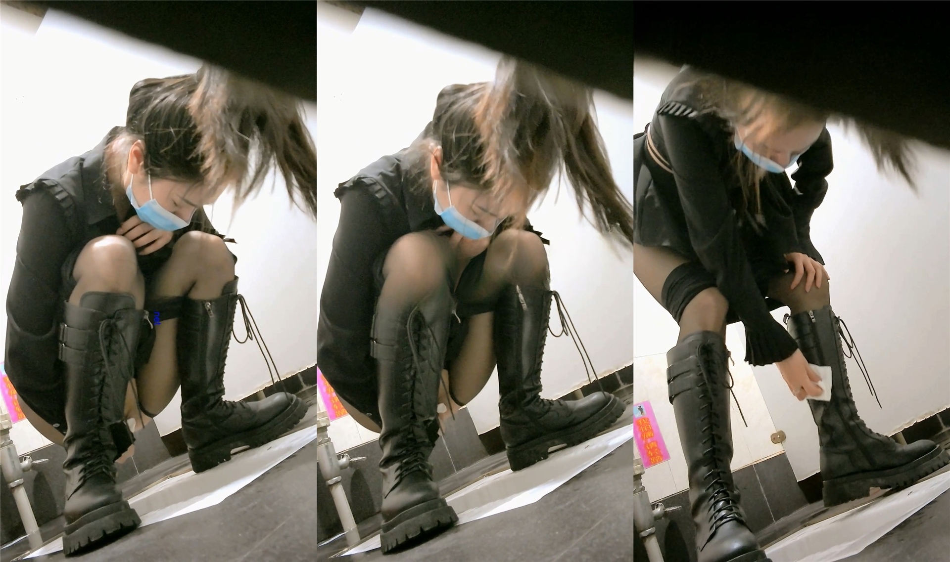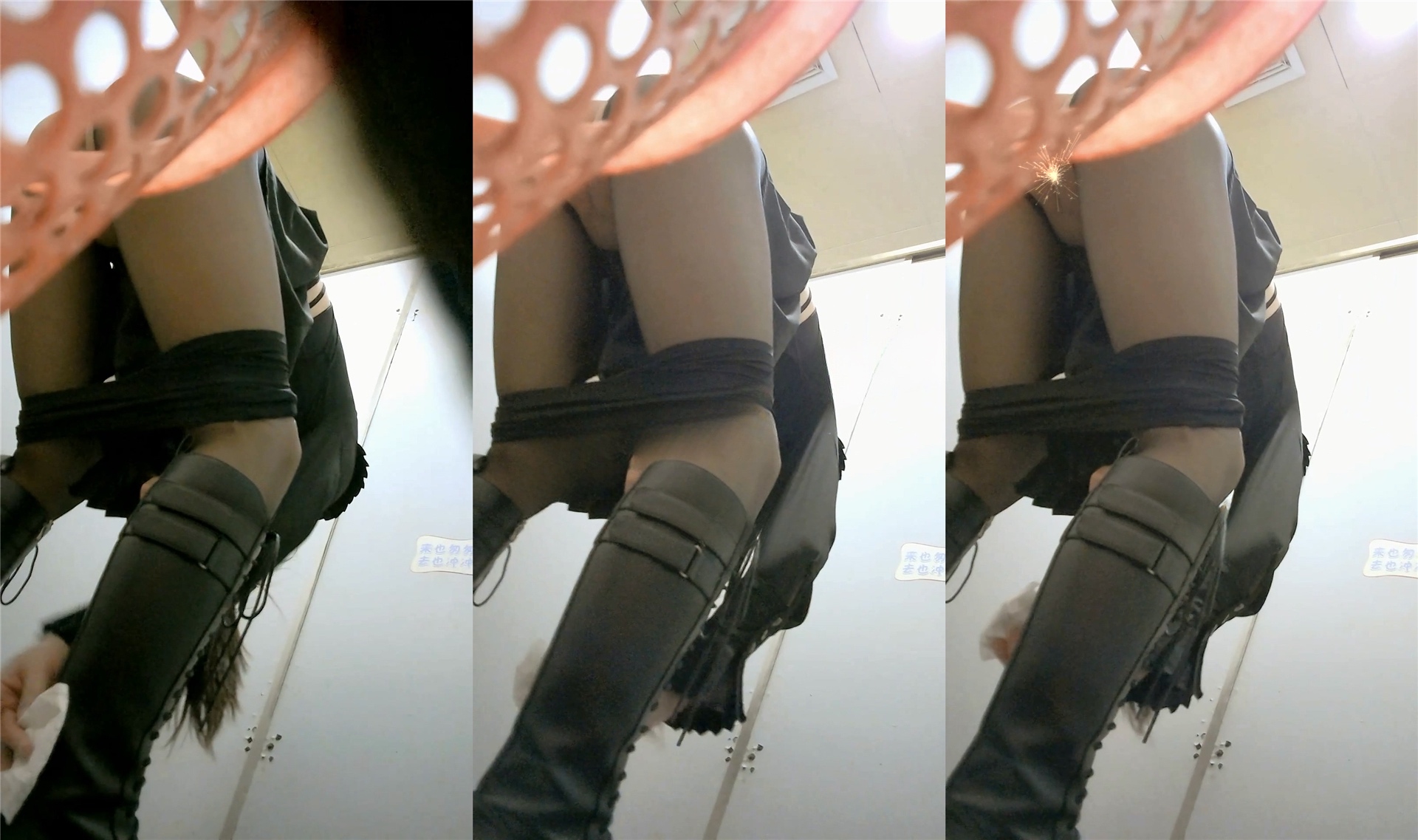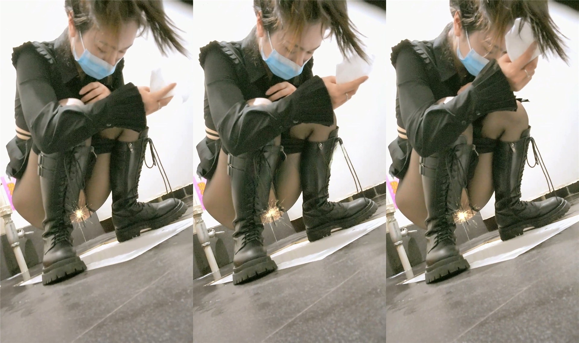 死死盯着只有一条缝的淫穴里滋着尿液打在便池上溅到了长筒靴